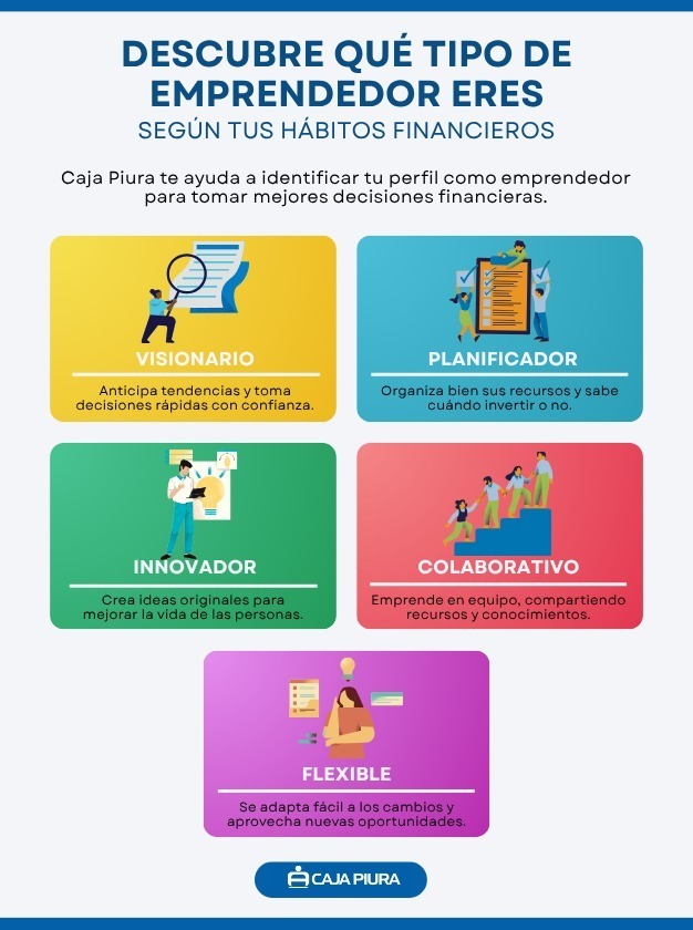 Caja Piura identifica cinco perfiles clave de emprendedores según su relación con el dinero: visionario, planificador, colaborativo, innovador y flexible.