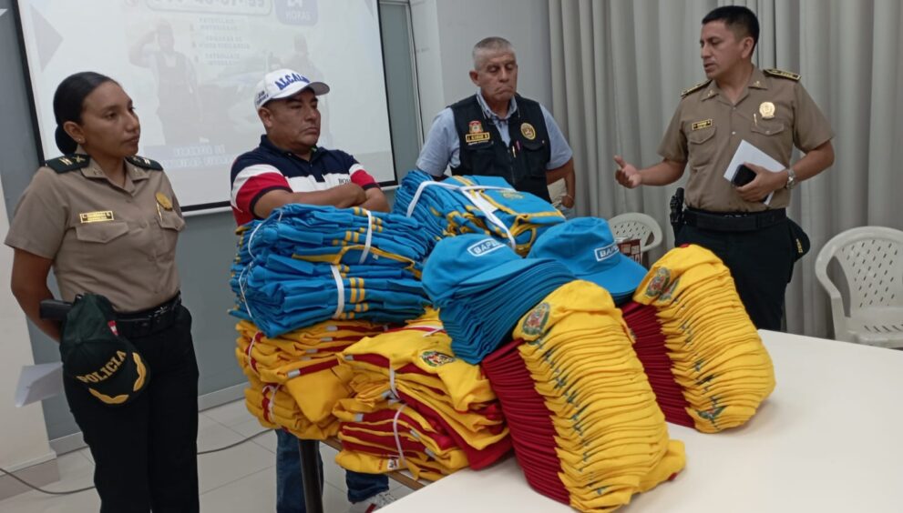 Fue al culminar la reunión del Comité Distrital de Seguridad Ciudadana, que lo preside el alcalde Juan Carranza Ventura, quien en compañía del gerente de Seguridad Ciudadana comandante EP (R) José Alvarado Mondoñedo, entregaron los 40 implementos a las JUVESC de color amarillo con filos rojos y 40 a las BAPES de color celeste, recibidos por el mayor PNP Jeinner Álvarez Pérez, jefe de la comisaría Nicolás Alcázar y la teniente PNP Lucero Machaca de la comisaría Sánchez Carrión, quienes a los que están en sus jurisdicciones.