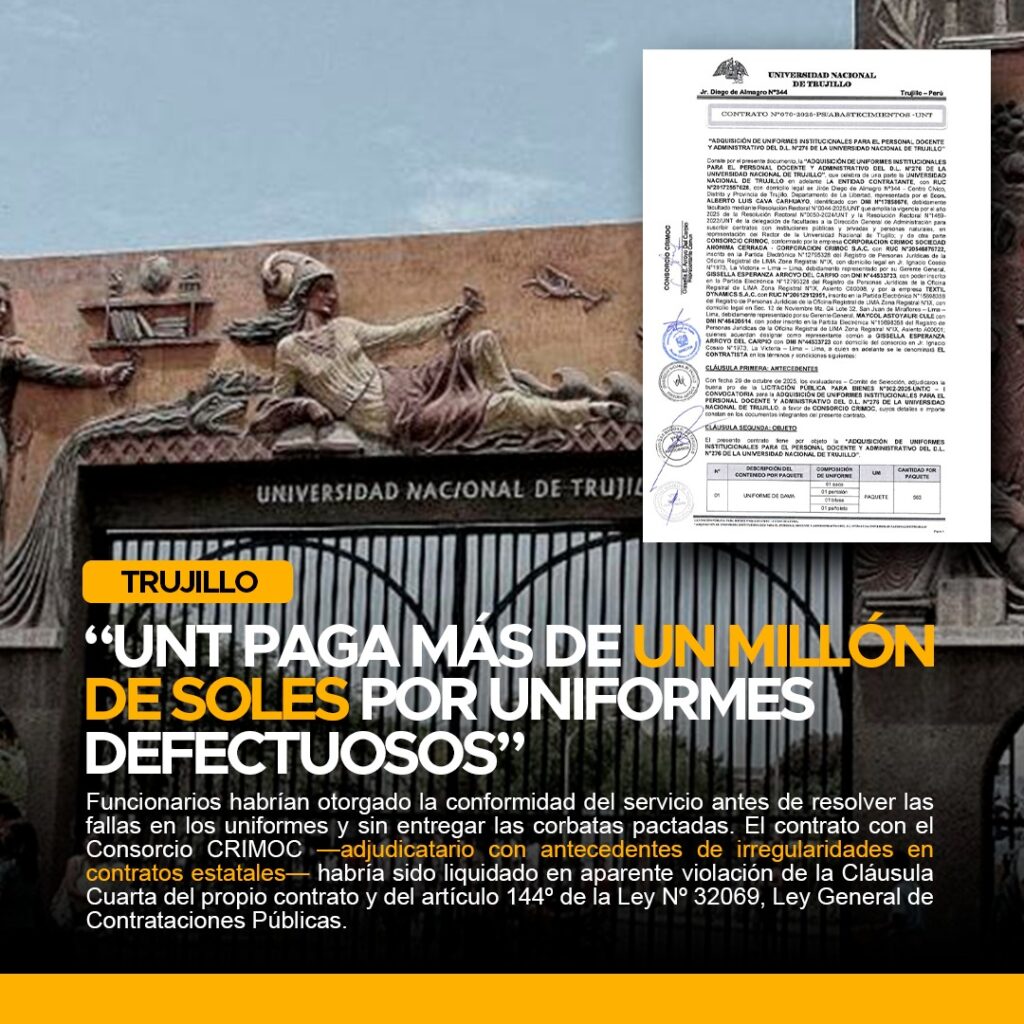 La Universidad Nacional de Trujillo (UNT) se encuentra en el ojo de la tormenta tras revelarse graves irregularidades en la ejecución del Contrato N°070-2025-PS/ABASTECIMIENTOS-UNT, suscrito el 03 de diciembre de 2025 con el Consorcio CRIMOC —conformado por Corporación Crimoc S.A.C. y Textil Dynamics S.A.C.— para la adquisición de uniformes institucionales destinados al personal docente y administrativo bajo el D.L. N°276. El monto total del contrato asciende a S/1’134,245.00 (un millón ciento treinta y cuatro mil doscientos cuarenta y cinco soles), financiados con recursos públicos de la institución trujillana.