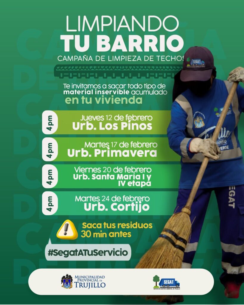 Para seguir preservando el ornato y mantener la ciudad más limpia, bella, ordenada y saludable, la Municipalidad Provincial de Trujillo (MPT) y el Servicio de Gestión Ambiental (Segat) están organizando para mañana jueves 12 de febrero la campaña Techo Limpio, en el territorio vecinal de la urbanización Los Pinos.