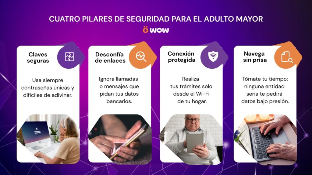 La brecha digital expone a los adultos mayores a riesgos cibernéticos que pueden comprometer su patrimonio y privacidad. En un entorno donde las estafas mediante phishing y la suplantación de identidad son cada vez más sofisticadas, fomentar la educación digital es fundamental. Conoce los 4 pilares esenciales para mantener una vida digital protegida: