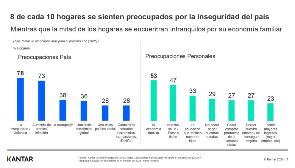 El último estudio de la División Worldpanel de la consultora empresarial Kantar se enfoca en conocer cuáles son las preocupaciones principales de los hogares peruanos de cara al nuevo año 2025. Los resultados revelan que lo que más zozobra causa en nuestro país es el clima de inseguridad y violencia, desplazando a un segundo lugar al aumento de precios e inflación que lideraron el ranking los últimos dos años.