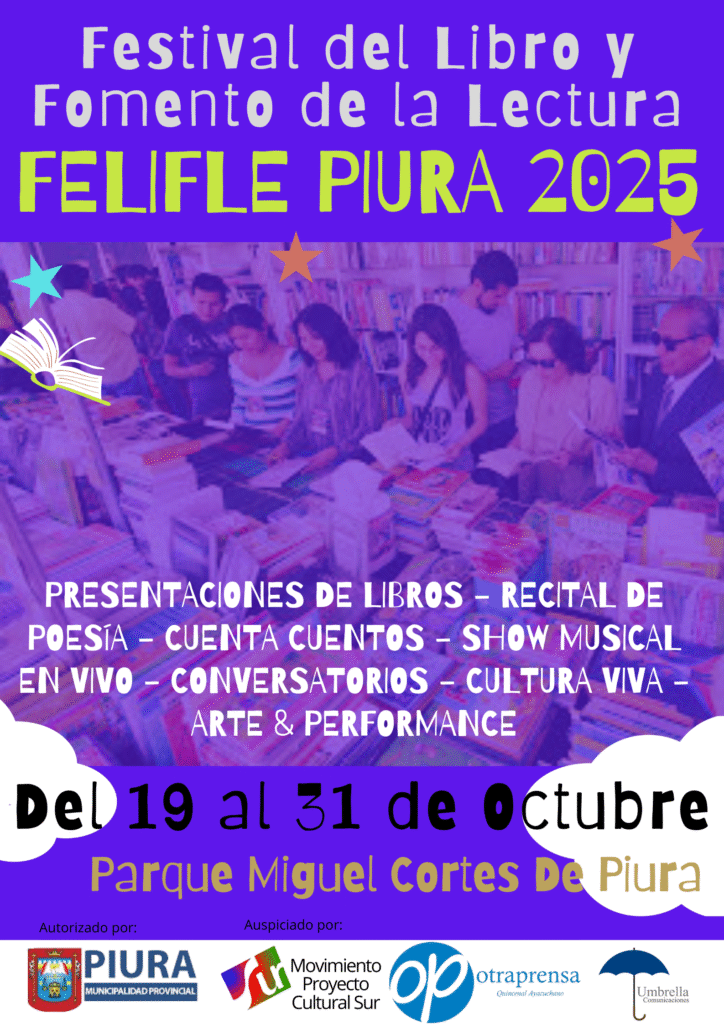 El Festival del Libro y Fomento de la Lectura – FELIFLE PIURA 2025 se realizará del 15 al 31 de octubre, en el parque Miguel Cortés, en la ciudad de Piura. El evento cultural contará con la participación de destacados escritores regionales, exposiciones, recitales y música en vivo.