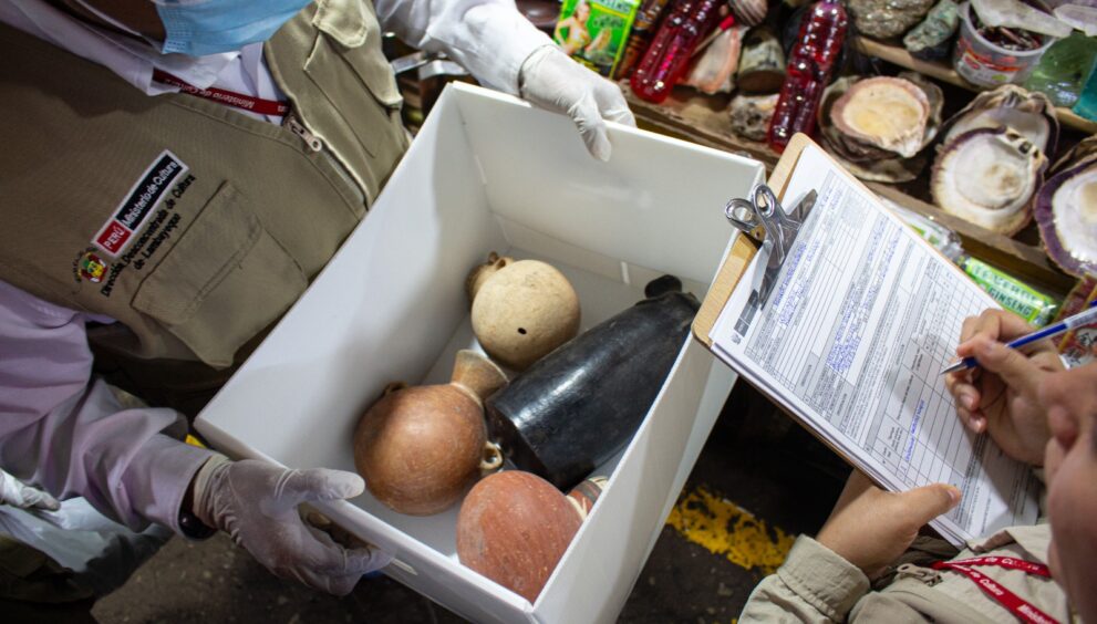 • Cántaros de cerámica y botellas prehispánicas fueron recuperados en un operativo de prevención realizado en el mercado Modelo de Chiclayo.El Ministerio de Cultura, a través de la Dirección Desconcentrada de Cultura (DDC) de Lambayeque, logró recuperar un total de ocho bienes culturales de origen prehispánico, como resultado de un operativo inopinado realizado en el Mercado Modelo de Chiclayo, en la región Lambayeque.Entre los objetos incautados figuran seis cántaros y dos botellas de cerámica, que, según los especialistas, serían piezas pertenecientes a las antiguas culturas Lambayeque, Chimú y Chancay.La intervención se llevó a cabo como parte de las acciones permanentes para la defensa del patrimonio cultural de la Nación, lideradas por la DDC Lambayeque, que actuó tras recibir información sobre la presunta comercialización de bienes culturales muebles en distintos puestos del referido centro de abastos.Este operativo fue realizado con la participación de arqueólogos y especialistas legales de la Subdirección de Patrimonio Cultural e Industrias Culturales e Interculturalidad de la DDC Lambayeque, en coordinación con la Segunda Fiscalía Provincial Especializada en Prevención de Delitos del distrito fiscal de Chiclayo y la policía fiscal.Como parte de esta diligencia, se intervino a dos personas que fueron trasladados a la comisaría de César Llatas Castro de Chiclayo para continuar con las investigaciones correspondientes.Cabe recordar que, según el artículo 228 del Código Penal, aprobado mediante Decreto Legislativo N.º 635, los delitos contra el patrimonio cultural de la Nación, como la comercialización de bienes culturales prehispánicos, son sancionados con penas privativas de libertad no menores de tres ni mayores de ocho años.De esta manera, el Ministerio de Cultura, reafirma su compromiso con el cuidado y defensa del patrimonio cultural, y la lucha contra su comercialización ilegal, promoviendo conciencia sobre la importancia de conservar nuestra historia y herencia cultural para las futuras generaciones.