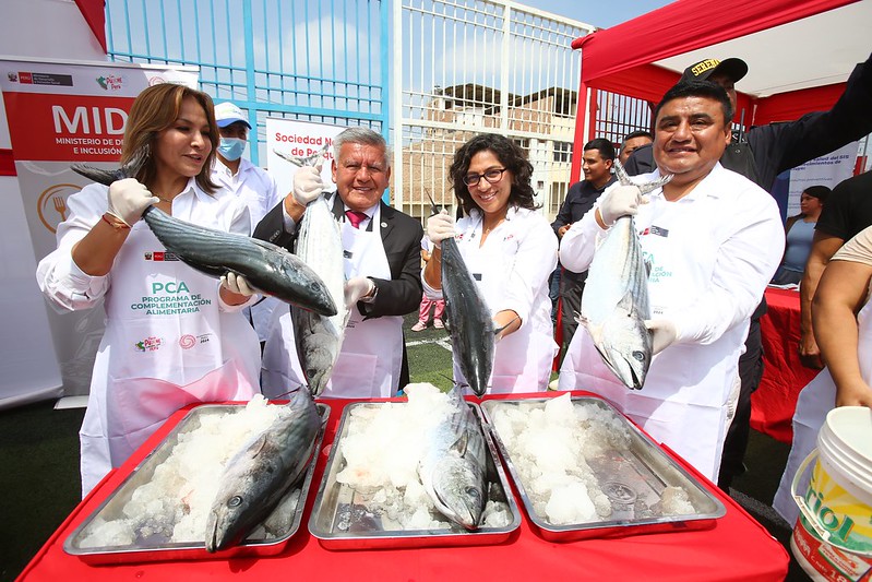 En el complejo deportivo “San Martín de Porres”, en el distrito de La Esperanza, la ministra también participó en la entrega de cuatro toneladas de pescado a representantes de ollas comunes y comedores populares, gracias a la acción articulada con la Sociedad Nacional de Pesquería y la Municipalidad Distrital de La Esperanza, en el complejo deportivo “San Martín de Porres”, con el fin de contribuir a la mejora alimentaria y prevención de la anemia en la población vulnerable.