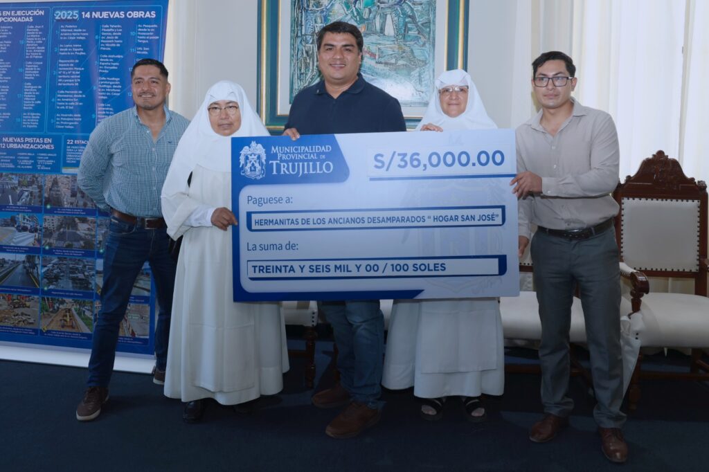 El alcalde provincial de Trujillo, Mario Reyna Rodríguez, otorgó un cheque por S/ 36 mil soles a favor de la Congregación de las Hermanitas de los Ancianos Desamparados, Hogar de Ancianos “San José”, representado por su superiora: Sor Pastora Judith Cosi Ticona.
