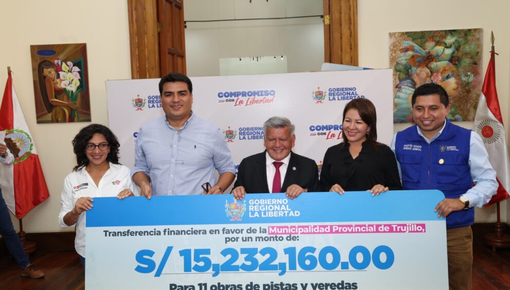 El alcalde de Trujillo, Mario Reyna Rodríguez, recibió del gobernador regional de La Libertad, César Acuña Peralta, un cheque simbólico por la suma de S/ 15, 232,160.00 para la ejecución de 11 obras de mejora integral de pistas y veredas en la ciudad.