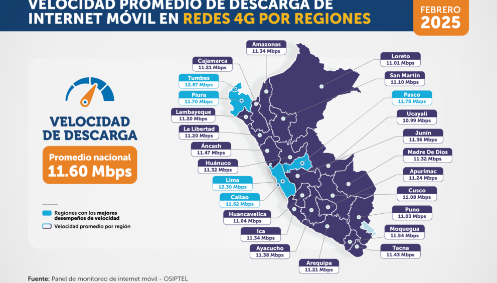 El internet móvil más veloz no se encuentra en Lima, pues la región que tuvo el mejor promedio de velocidad de descarga para redes móviles 4G, en febrero, fue Tumbes con 12.87 Mbps (megabits por segundo), cifra por encima del promedio nacional (11.60 Mbps), informó el Organismo Supervisor de Inversión Privada en Telecomunicaciones (OSIPTEL).