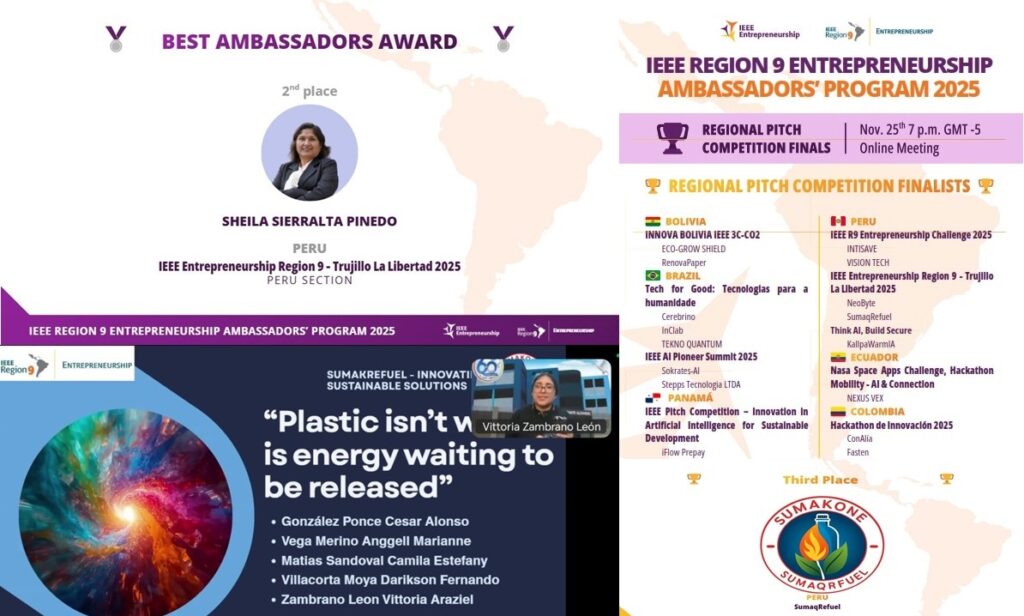 Reconocimiento a la excelencia: La competencia también destacó el trabajo de la Dra. Sheila Sierralta Pinedo, quien obtuvo el segundo lugar en el Best Ambassadors Award del IEEE Entrepreneurship Region 9 – Trujillo La Libertad 2025, reconociendo su invaluable labor como embajadora de emprendimiento en la Sección Perú.