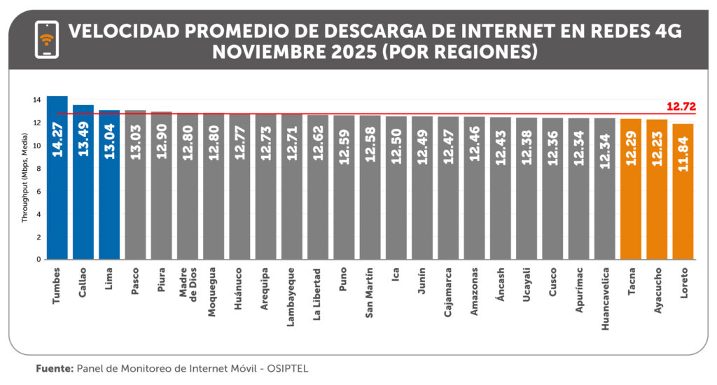 El análisis por regiones mostró que Tumbes (14.27 Mbps) tuvo el mejor promedio de velocidad de descarga a nivel nacional, seguido de Callao (13.49 Mbps) y Lima (13.04 Mbps). En tanto, Tacna (12.29 Mbps), Ayacucho (12.23 Mbps) y Loreto (11.84 Mbps) registraron los desempeños más bajos.