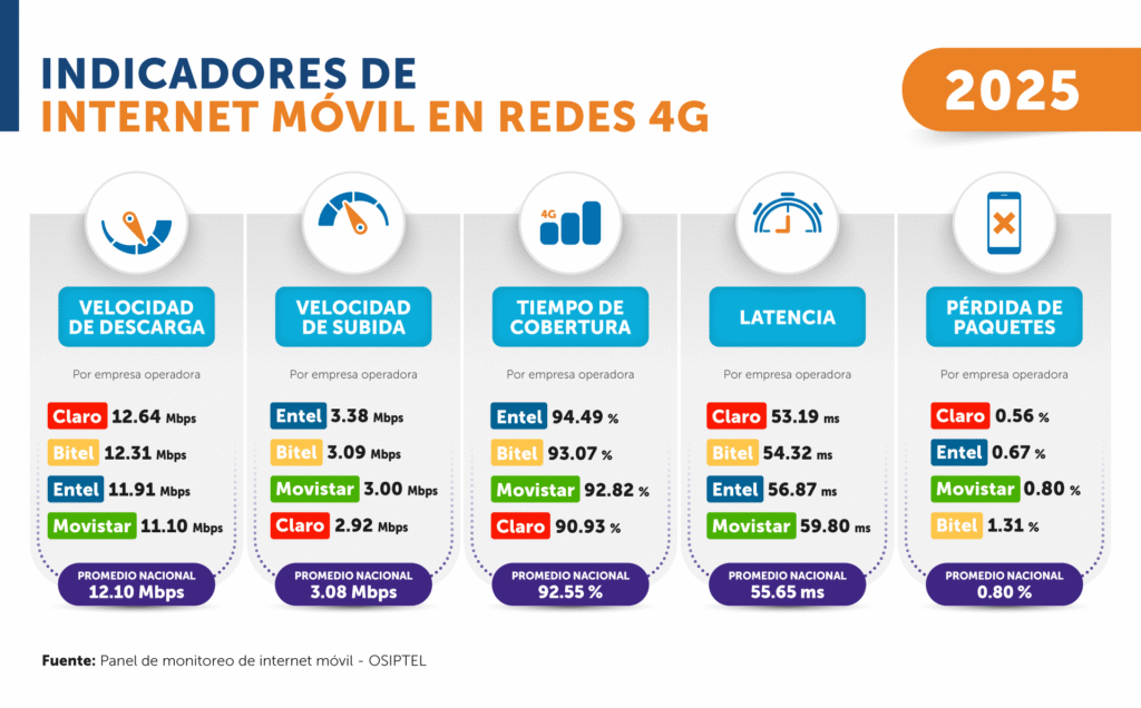 Según datos reportados al Panel de Monitoreo del Internet Móvil del OSIPTEL, Entel (79.18 %) y Claro (78.60 %) tuvieron los mejores desempeños en la evaluación anual de indicadores, con promedios por encima de la media anual (77.88 %). A continuación, se ubicaron Bitel (77.42 %) y Movistar (75.71 %).