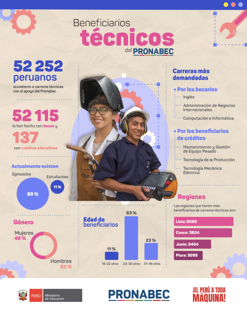 Más de 52 000 peruanos accedieron a carreras técnicas con el apoyo de becas y créditos del Programa Nacional de Becas y Crédito Educativo (Pronabec) del Ministerio de Educación. De ellos, 9 de cada 10 (89 %) ya culminaron sus estudios y ahora son profesionales técnicos con mayores oportunidades de inserción y crecimiento en el mercado laboral.