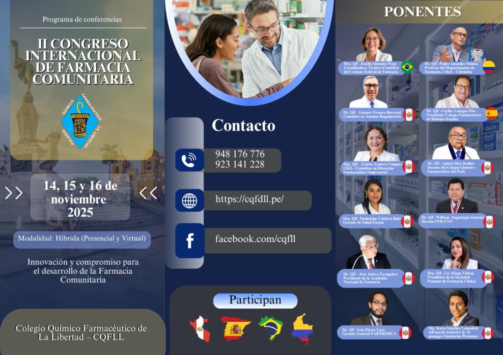 ​El Colegio Químico Farmacéutico de La Libertad (CQFLL) se prepara para ser el anfitrión del II Congreso Internacional de Farmacia Comunitaria, un evento clave que reunirá a destacados profesionales de Perú y del mundo. El congreso se desarrollará en modalidad Híbrida (Presencial y Virtual) los días 14, 15 y 16 de noviembre de 2025.