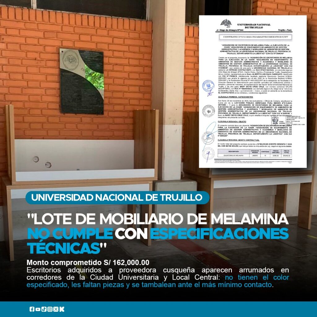 La Universidad Nacional de Trujillo (UNT), institución bicentenaria considerada la más antigua del norte del Perú, se encuentra en el centro de una preocupante controversia sobre gestión del gasto público. Un lote de mobiliario de melamina adquirido mediante el Contrato N.° 073-2025-PS/ABASTECIMIENTOS-UNT, valorizado en S/ 162,000.00 soles, permanece arrumado en los corredores de la Ciudad Universitaria y del Local Central, sin que ninguna unidad receptora haya procedido a formalizarlo con la conformidad de recepción correspondiente.